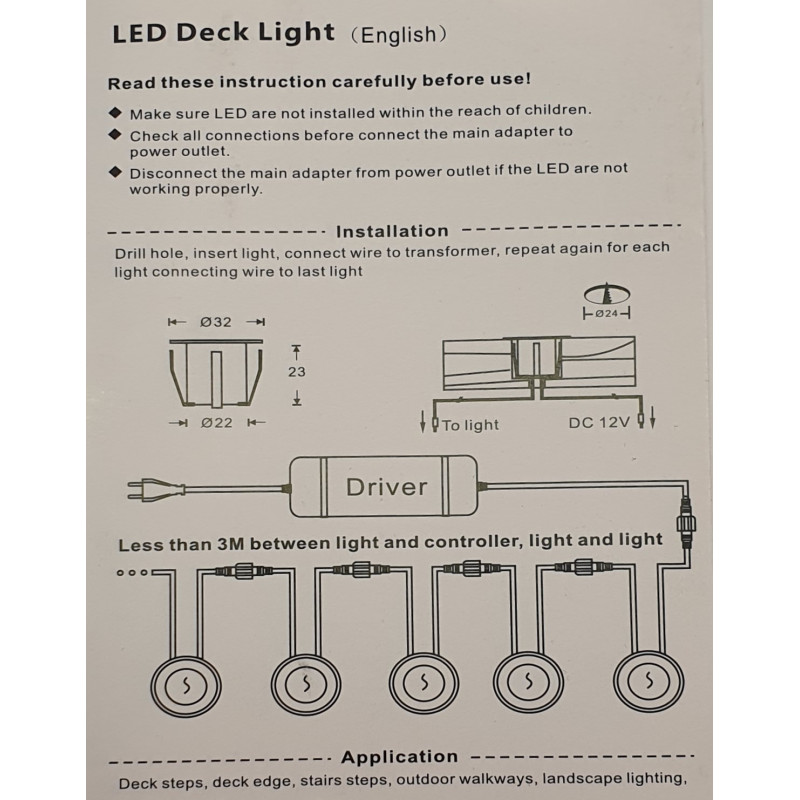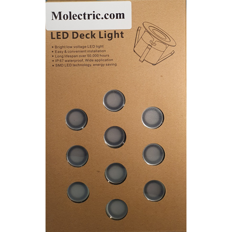Enkel att koppla in! Allt kommer färdigt med anslutningar, ingen elektriker behövs! Alla produkter i denna serie levereras med 1 meter kabel mellan lamporna. Både lamporna och trafon håller IP-klass 67 Den fungerar på 12 Volt, vilket gör den lämplig som belysning även i båtar, husvagnar m.m. Då behöver man inte använda transformatorn utan kopplar lamporna direkt till 12 Volt. Decklights för inom eller utomhusbruk.