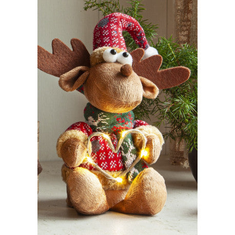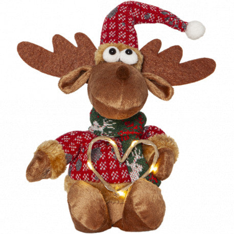 En mysig älg med julkläder som sprider värme och julkänsla. Hjärtat lyser fint med små ljuspunkter. Dekorera med till jul och advent. Drivs med batterier.