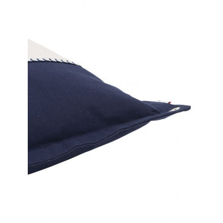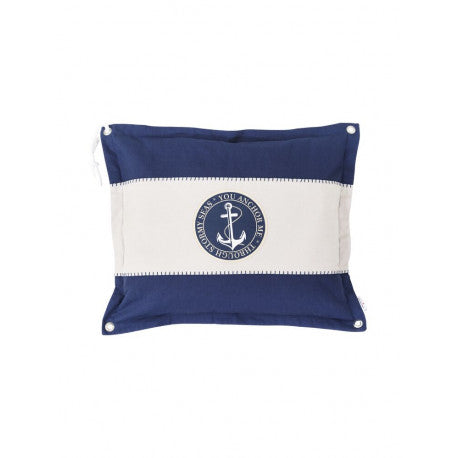 Marint kuddfodral i bomull. Klassiska ankaret i mitten, röda kontrastsömmar på marinblå botten och öljetter i sidan gör att den passar fint för den som älskar hav- och sjöliv.