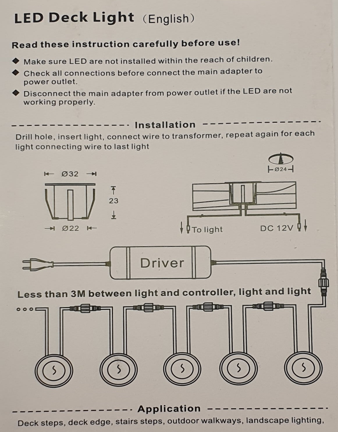 Enkel att koppla in! Allt kommer färdigt med anslutningar, ingen elektriker behövs! Alla produkter i denna serie levereras med 1.5 meter kabel mellan lamporna och hela 10 meter mellan lampor och trafon. Både lamporna och trafon håller IP-klass 67 Den fungerar på 12 Volt, vilket gör den lämplig som belysning även i båtar, husvagnar m.m. Då behöver man inte använda transformatorn utan kopplar lamporna direkt till 12 Volt. Decklights för inom eller utomhusbruk.