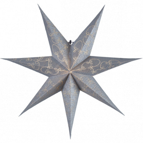 Pappersstjärna i silver med hålmönster och struktur. Stämningsfull stjärna att hänga upp i fönstret för att skapa julkänsla. Papper av återvunnen bomull.