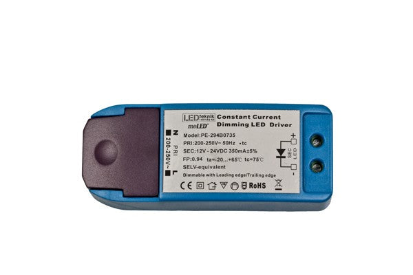 Dimbar drivare för konstantströms LED som drivs på 350mA. Dimmningen sker på primärsidan och kan då dimmas med i princip vilken universal, elektronisk eller glödljusdimmer som helst.