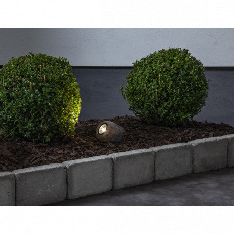 Solcellsdriven belysning i form av en sten som gör att den är enkel att placera i trädgården.
