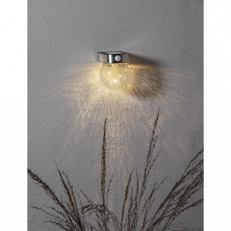 Solcells vägglykta med PIR och skymningssensor. PIR sensorn fungerar på 5-8m avstånd och lyktan lyser upp med 100 Lumen i 60 sekunder, därefter lyser den med 5 Lumen. Användbar "fasadbelysning" på många olika ställen.