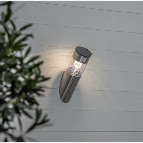 Solcells väggbelysning med PIR och skymningssensor. När sensorn aktiveras lyser den med 80 lumen under 40 sekunder och sedan ner till 10 lumen. Sensoravstånd från 5 till max 8m med 100 graders vinkel.