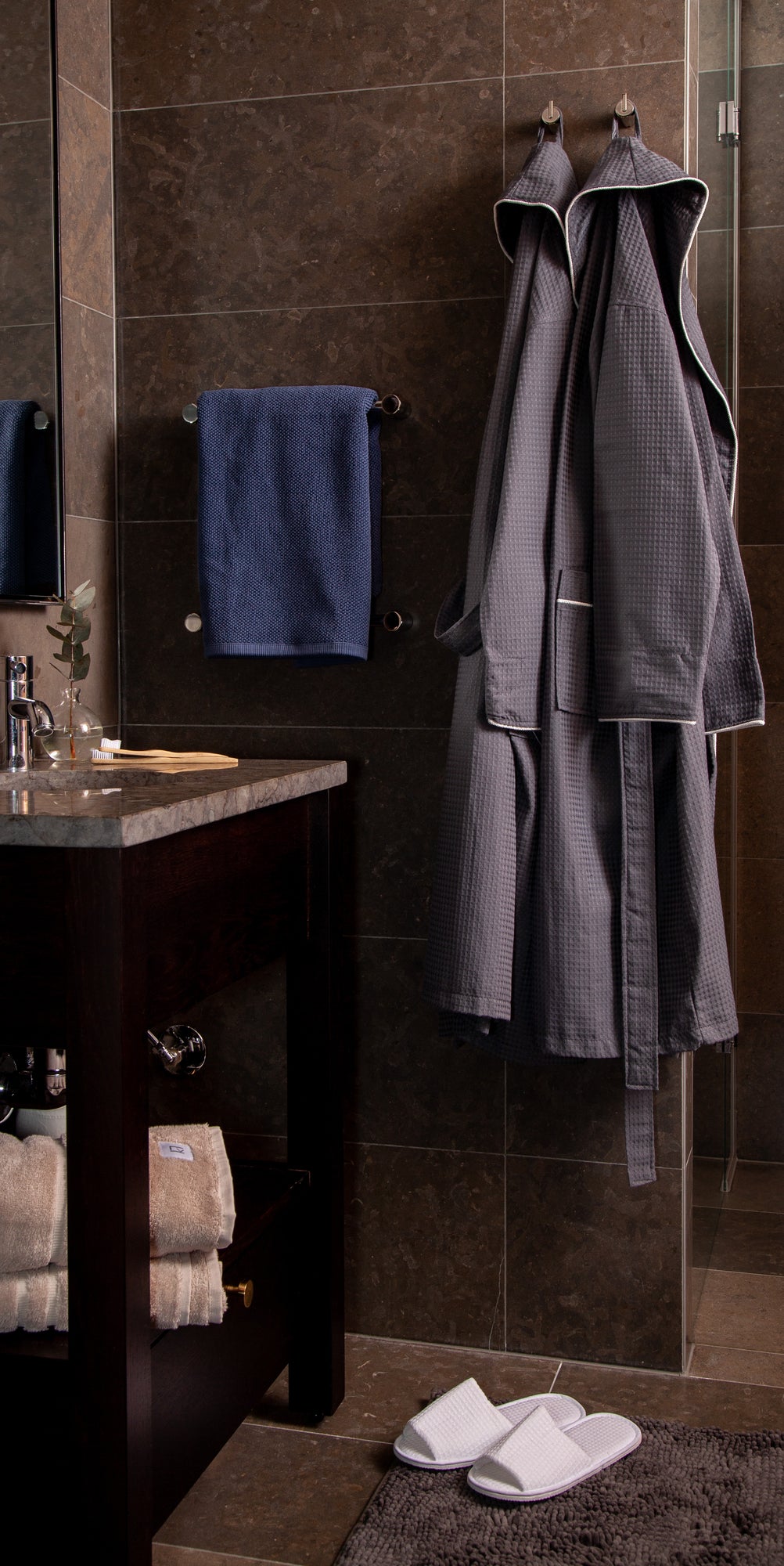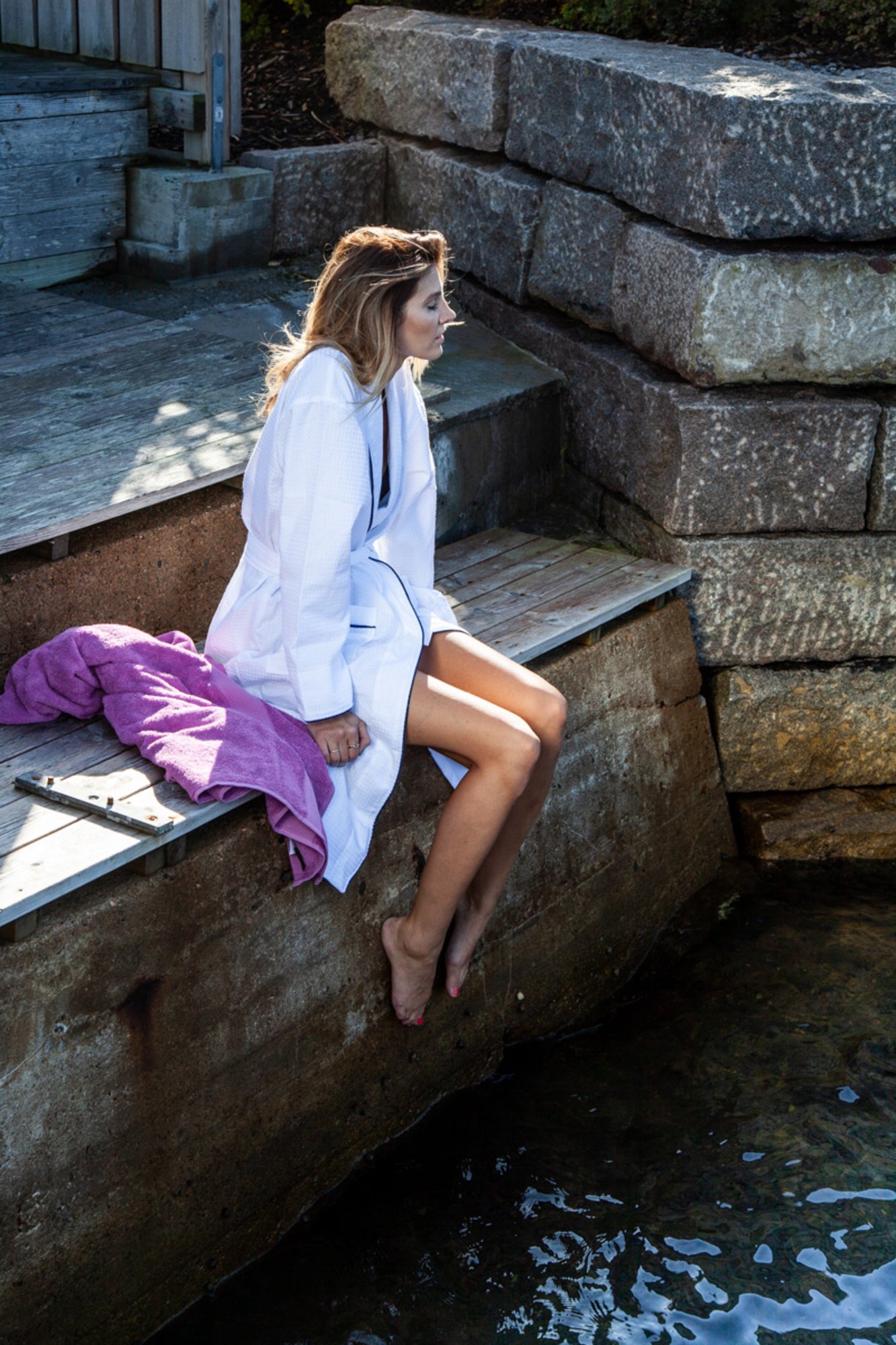 En lyxigt designad, våfflad, sparock. Perfekt att svepa om dig efter ett dopp i bubbelpoolen. Tar lite plats och är lätt att hantera. Den torkar snabbt. Sparocken har en snygg och stilren piping på krage, fickorna och ärmen. Den vita rocken har en mörkblå piping och den grå har en vit piping.