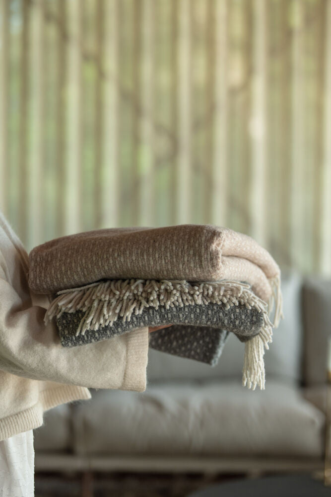 Mjuk och skön filt med fransar vävd i värmande ullmix. Tidlös och elegant design som enkelt ger liv åt en soffa eller säng.