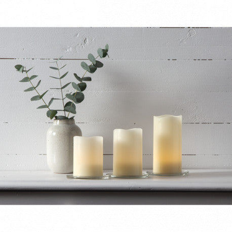 Fint 3-pack batteridrivna vaxljus med fina vågkanter. Perfekta för att lysa upp i hemmet och skapa mysig stämning. De är 10, 12 och 15cm höga.